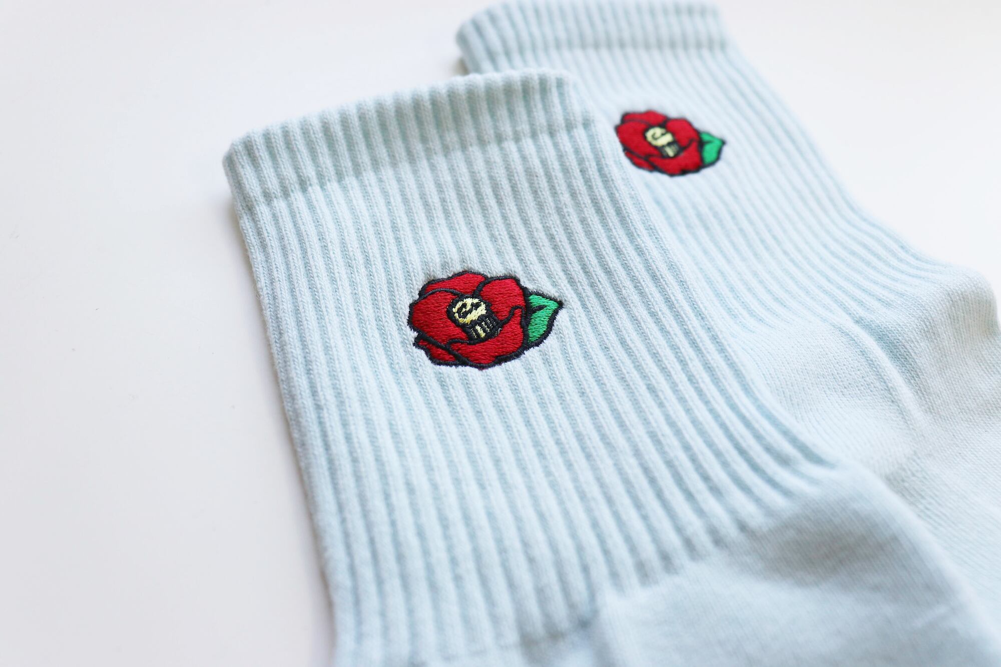 刺繍の靴下〈椿〉アイスブルー(レディース)