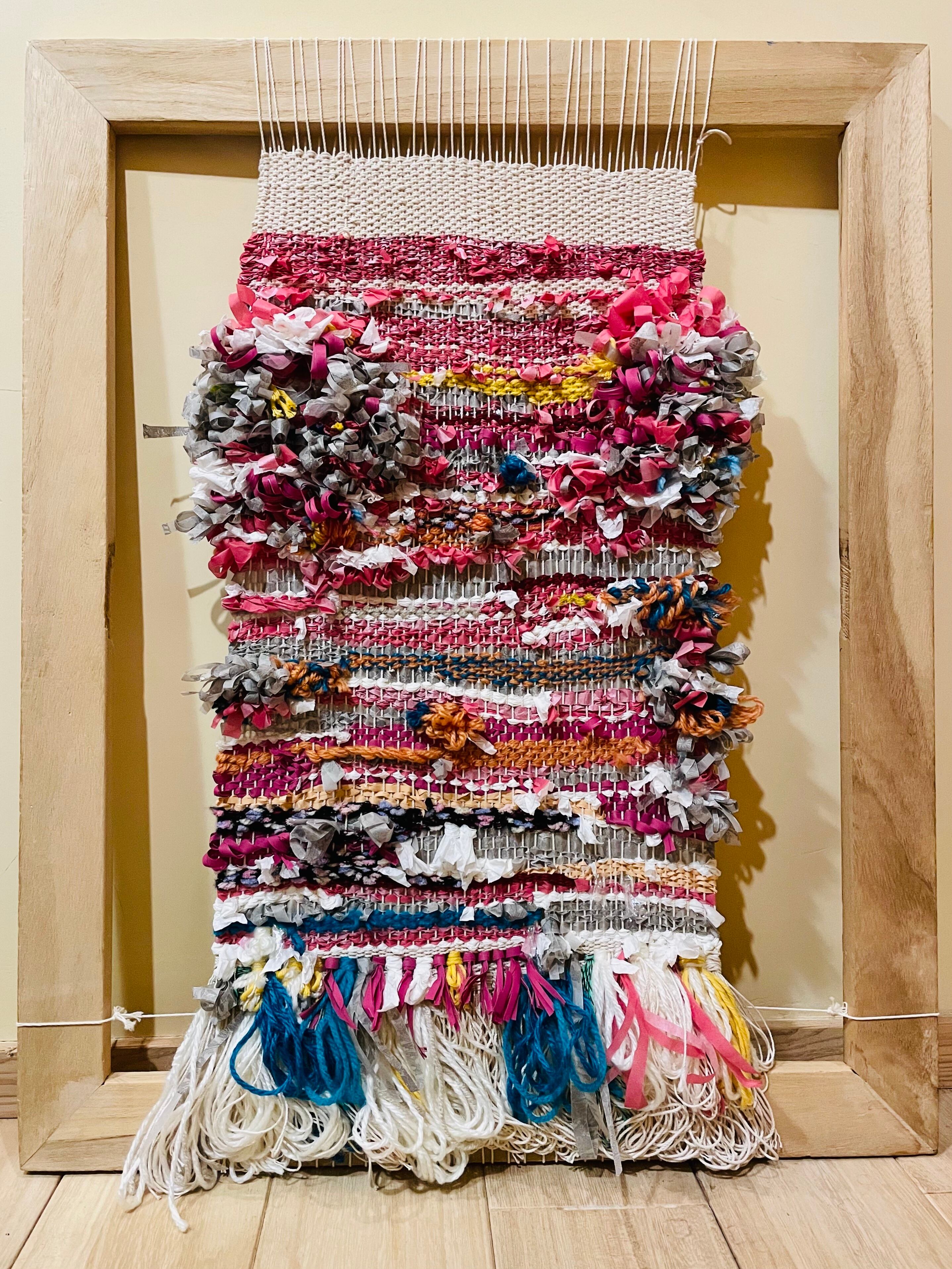 毛糸や色々な素材と組み合わせ、世界に一つだけのタペストリーに仕上げます。